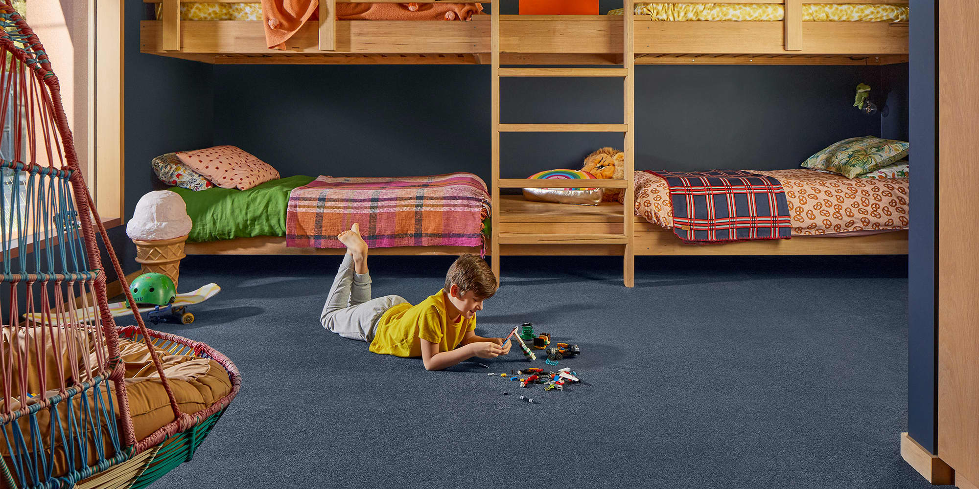 The “pile” of a carpet refers to the height and density of its individual fibres. The term “low pile carpet” describes any carpet made from short fibres that are sewn together in tight, dense rows. This creates a uniform, even appearance, with a texture that is smooth to both the eye and the touch. Low pile carpet is often recommended for children’s rooms, rooms with heavy foot traffic, and hallways.What is high pile carpet?